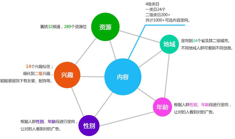 支持资源、地域、兴趣、年龄、性别、内容六大维度定向设置。